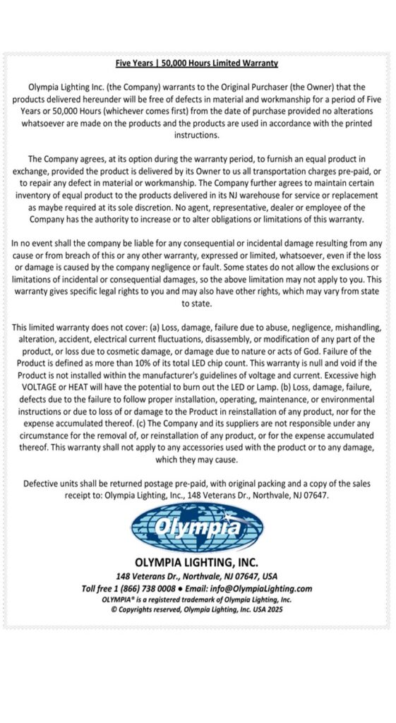 About Us Olympia Lighting designs, manufactures, and sells industrial grade LED lights & fixtures for the commercial lighting industry. Olympia is the ONLY Company to offer 500W LED lamp replacements for 1,000-2,000 Watt Metal Halide lamps in 120V, 277V & 480V. Our LED lights are built to the highest quality standards using the best LEDs to ensure maximum efficiency and longevity. Our products are competitively priced and perfectly fit existing commercial fixtures. Olympia offers a range of LED replacement bulbs from 50W to 2,000W HID lamps. Our LED lights come with up to 100,000 hours, 10-Year Manufacturer Warranty backed by our local service in the USA.
